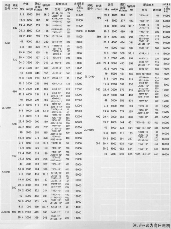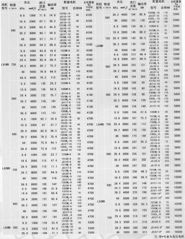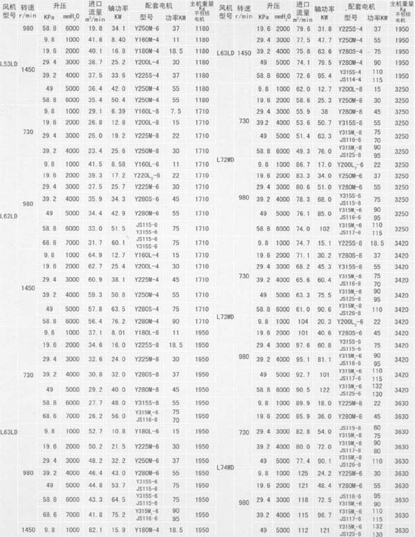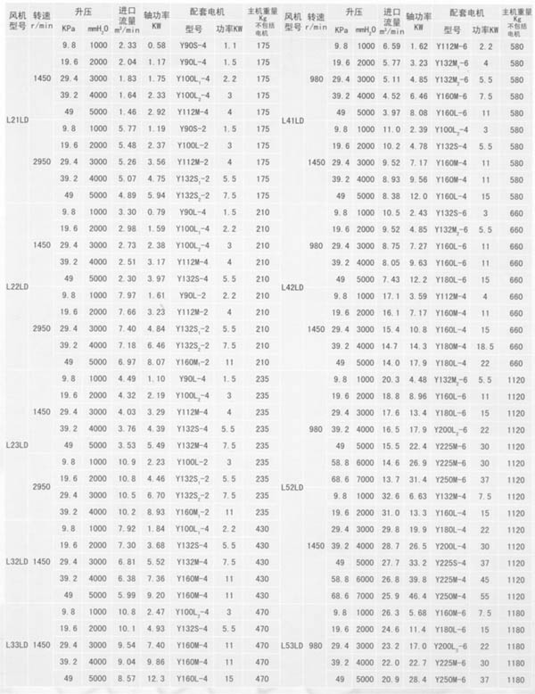 L系列羅茨鼓風(fēng)機(jī)性能參數(shù)表